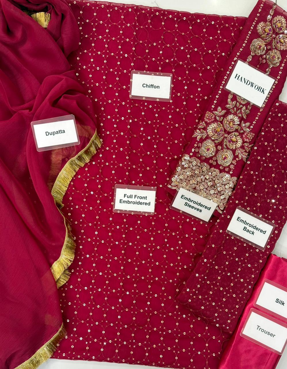 Shocking Pink Embroidered Chiffon Suit With Handwork Sleeves, Malai Trouser & Chiffon Dupatta With Lace Detailing.